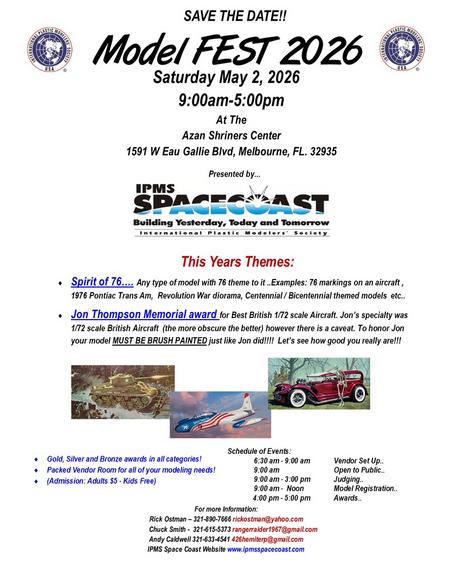 That's right!, ModelFEST 2026 will be on Saturday May 2, 2026 at the Azan Shriners Center (1591 W. Eau Gallie Blvd. Melbourne FL. 32935)